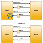 ● SPA란?- Single Page Application(단일 페이지 어플리케이션) - 기존 웹 서비스는 요청시마다 서버로부터 리소스, 데이터를 해석하고 화면에 랜더링 하는 방식 - 그러나 SPA형태는 브라우저에 최초에 한번 페이지 전체 로드 후 이후 부터 특정 부분만 Ajax를 통해 데이터를 바인딩하는 방식 - 전통적인 페이지 vs 단일 페이지 어플리케이션 비교 - 예전부터 개발자들은 지속적으로 웹서비스와 개발방식을 발전 시켜옴 - CSS, JS 리소스 등 CDN형태로 캐싱 및 압축하고, View에서 템플릿엔진 들을 사용하고, 초기 SPA개념인 Backbone.js, Angular.js 라이브러리들이 나왔고, 지금은 템플릿 개념을 지나 컴포넌트 개념인 React.js, Vue.js, Angular2 ..